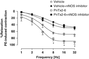 Erectile dysfunction (ED) mechanisms in diabetic patients are multifactorial and often lead to resistance to current therapy. Animal toxins have been used as pharmacological tools to study penile erection. Human accidents involving the venom of Phoneutria nigriventer spider are characterized by priapism. We hypothesize that PnTx2-6 potentiates cavernosal relaxation in diabetic mice by increasing cyclic guanosine monophosphate (cGMP). This effect is neuronal nitric oxide synthase (nNOS) dependent. Cavernosal strips were contracted with phenylephrine (10−5 M) and relaxed by electrical field stimulation (20 V, 1–32 Hz) in the presence or absence of PnTx2-6 (10−8 M). Cavernosal strips from nNOS- and endothelial nitric oxide synthase (eNOS)-knockout (KO) mice, besides nNOS inhibitor (10−5 M), were used to evaluate the role of this enzyme in the potentiation effect evoked by PnTx2-6. Tissue cGMP levels were determined after stimulation with PnTx2-6 in presence or absence of N-nitro-L-arginine methyl ester (L-NAME) (10−4 M) and ω-conotoxin GVIA (10−6 M), an N-type calcium channel inhibitor. Results showed that PnTx2-6 enhanced cavernosal relaxation in diabetic mice (65%) and eNOS KO mice, but not in nNOS KO mice. The toxin effect in the cavernosal relaxation was abolished by nNOS inhibitor. cGMP levels are increased by PnTx2-6, however, L-NAME abolished this enhancement as well as ω-conotoxin GVIA. We conclude that PnTx2-6 facilitates penile relaxation in diabetic mice through a mechanism dependent on nNOS, probably via increasing nitric oxide/cGMP production.