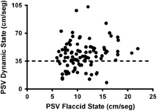 Previous studies have suggested that parameters measured in the flaccid state (FS) by penile duplex Doppler ultrasound (PDDU) may predict the outcome after intracavernosal injection (ICI). The aim of this study was to evaluate the association between peak systolic velocity (PSV) and cavernosal artery diameter (CAD) in the FS with PSV and clinical assessment of erection hardness (CAEH) after ICI. Fifty patients who underwent PDDU for erectile dysfunction were prospectively enrolled. PSV and CAD were measured in FS and then correlated with PSV and CAEH after ICI of 20 μg of e1 prostaglandin (PGe1). Even though PSV in FS demonstrated a significant correlation with PSV after ICI (P=0.04, r=0.21), none of the cutoff values tested (10, 13 and 15 cm s−1 in FS) had a combined sensitivity and specificity >80% to predict a PSV after ICI ⩾30 cm s−1. No correlation was observed between CAD in FS and PSV after ICI. Also, no association was observed between PSV in FS and development of a complete full rigid erection after ICI. Although PSV in FS statistically correlates with PSV after ICI, predictive values are low, making it non-reliable to predict accurately the response to ICI of 20 μg PGe1.