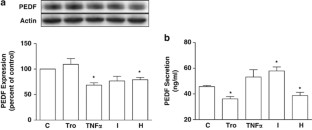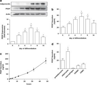 Human primary adipocytes secrete 130 ng ml−1 PEDF over 24 h from 1 million cells, which is extremely high as compared with adiponectin, interleukin-6 (IL-6) or IL-8. This release of PEDF is significantly higher than from other primary cells, such as adipose-tissue located macrophages (50-times), hSkMC and hSMC (5-times). PEDF protein expression significantly increases during adipogenesis, which is paralleled by increased PEDF secretion. Furthermore, tumor necrosis factor-α and hypoxia significantly downregulate PEDF protein levels. PEDF secretion was significantly reduced by troglitazone and hypoxia and significantly increased by insulin. Treatment of adipocytes and hSkMC with PEDF induced insulin resistance in adipocytes, skeletal and smooth muscle cells at the level of insulin-stimulated Akt phosphorylation, which was dose dependent and more prominent in adipocytes. Furthermore, inflammatory nuclear factor-κB (NF-κB) signaling was induced by PEDF. In hSMC, PEDF induced proliferation (1.7-fold) and acutely activated proliferative and inflammatory signaling pathways (NF-κB, p38 mitogen-activated protein kinase and mammalian target of rapamycin).