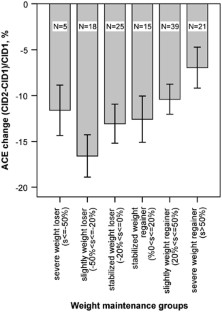 A greater reduction of ACE during weight loss is favorable for weight maintenance in both men and women. This can offer useful information for personalized advice to improve weight loss maintenance. It also confirms the role of ACE in the metabolic pathways of weight regulation.
