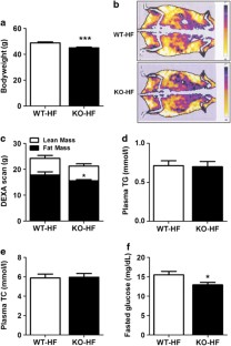 Twelve-week-old whole-body macroH2A1 KO male mice were given a high-fat diet (60% energy from lard) for 12 weeks until being killed, and examined for glucose and insulin tolerance, and for body fat composition. Energy expenditure was assessed using metabolic cages and by measuring the expression levels of genes involved in thermogenesis in the brown adipose tissue (BAT) or in adipogenesis in the visceral adipose tissue (VAT).