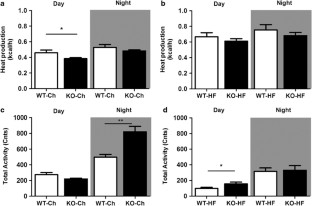 Under a chow diet, macroH2A1 KO mice did not differ from their wild-type (WT) littermates for body weight, and for sensitivity to glucose or insulin. However, KO mice displayed decreased heat production (P<0.05), and enhanced total activity during the night (P<0.01). These activities related to protection against diet-induced obesity in KO mice, which displayed decreased body weight owing to a specific decrease in fat mass (P<0.05), increased tolerance to glucose (P<0.05), and enhanced total activity during the day (P<0.05), compared with WT mice. KO mice displayed increased expression of thermogenic genes (Ucp1, P<0.05; Glut4, P<0.05; Cox4, P<0.01) in BAT and a decreased expression of adipogenic genes (Pparγ, P<0.05; Fabp4, P<0.05; Glut4, P<0.05) in VAT compared with WT mice, indicative of augmented energy expenditure.