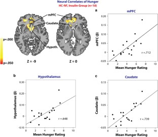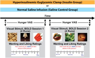 Thirty-four right-handed healthy non-obese subjects (19F/15M, age: 29±8 years.; BMI: 23.1±2.1 kg m−2) were divided in two groups matched by age and BMI; the insulin group (18 subjects) underwent a hyperinsulinemic-euglycemic-clamp, and the control group (16 subjects) received an intravenous saline infusion, while viewing high and low-calorie food and non-food pictures during a functional MRI scan. Motivation for food was determined via analog scales for hunger, wanting and liking ratings.