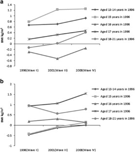 In ancestry-stratified models of 5962 European American (EA), 2080 African American (AA) and 1582 Hispanic American (HA) individuals from the National Longitudinal Study of Adolescent to Adult Health (Add Health), we examined associations between 34 obesity single-nucleotide polymorphisms (SNPs) with per year change in BMI, measured by the slope from a growth-curve analysis of two or more BMI measurements between adolescence and young adulthood. For SNPs nominally associated with BMI change (P<0.05), we interrogated age differences within data collection Wave and time differences between age categories that overlapped between Waves.
