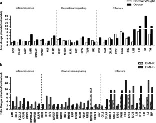 Cross-sectional analyses showed that the LPS-induced expression of genes involved in inflammasome (NLRP3, caspase 5 and NAIP), Nod-like receptors (NLRX1 and NOD1), downstream signaling (P2RX7, RAGE, RIPk2, TIRAP and BIRC2) and effector molecules (IFN-γ, IL-12β, IL-1β, CCL2, CCL5, IL-6 and TNFα) was significantly increased in obese subjects at baseline as compared with normal weight controls. The baseline plasma concentration of inflammasome-related cytokines (IL-1β and IL-18) and of microbial translocation markers (LPS and sCD14) was augmented in obese subjects as compared with controls as well. Longitudinal analyses indicated that intensive lifestyle modification resulted in a normalization of parameters in subjects with a significant reduction of BMI after 18 months.