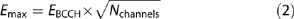 where Emax is the maximum electric field, EBCCH is the GSM broadcast control channel, and N is the number of traffic channels. If N is unknown then it is taken as equal to 4, for a doubling of the E-field (4 times in power density).