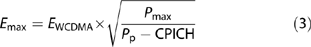 where Emax is the maximum electric field, EWCDMA is the WCDMA pilot control channel, Pmax is the maximum possible WCDMA power and PP−CPICH is the power of the pilot channel. Typically, PP−CPICH transmits with a constant power at 10% of Pmax, this leads to a threefold increase of the E-field (10 times in power density).