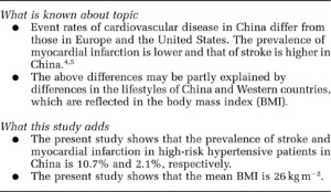 Hypertension is a major cause of morbidity and mortality, and an important public health challenge worldwide. Approximately 26.4% of the adult population worldwide had hypertension in 2000, and this is expected to increase to 29.2% by 2025.1 Hypertension accounts for approximately two-thirds of all strokes and 50% of heart attacks. It causes 7.1 million premature deaths per year and 4.5% of the global burden of diseases.2 In China, according to the 2002 National Nutritional Survey, hypertension affects 18.8% of the adult population and is a leading cause of heart disease, stroke and kidney failure.3 There are more than 1.5 million new-onset strokes in China every year.4 The slope of the relationship between blood pressure (BP) and stroke in China and the Asia-Pacific region is steeper than that in western studies.5 This means that a better control of hypertension might have substantial beneficial effects on the cardiovascular morbidity and mortality. Many large clinical trials and meta-analyses6, 7, 8, 9, 10 showed that effective BP control can significantly reduce cardiovascular morbidity and mortality. There was a 22% reduction in coronary heart disease (CHD) events and a 41% reduction in stroke for a systolic BP reduction of 10 mm Hg or diastolic BP reduction of 5 mm Hg.10 Therefore, an important key to reducing the burden of hypertension-related cardiovascular disease (CVD) is to increase the proportion of patients who achieve optimal BP control.