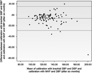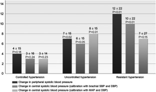Using the Sphygmocor device it is recommended that the radial pressure wave is calibrated for brachial systolic blood pressure (SBP) and diastolic blood pressure (DBP). However it has been suggested that brachial-to-radial pressure amplification causes underestimation of central blood pressures (BPs) using this calibration. In the present study we examined if different calibrations had an impact on estimates of central BPs and on the clinical interpretation of our results. On the basis of ambulatory BP measurements, patients were categorized into patients with controlled, uncontrolled or resistant hypertension. We first calibrated the radial pressure wave as recommended and afterwards recalibrated the same pressure wave using brachial DBP and calculated mean arterial pressure. Recalibration of the pressure wave generated significantly higher estimates of central SBP (P=0.0003 and P<0.0001 at baseline and P=0.0001 and P=0.0002 after 6 months). Using recommended calibration we found a significant change in central SBP in both treatment groups (P=0.05 and P=0.01), however, after recalibrating significance was lost in patients with resistant hypertension (P=0.15). We conclude that calibration with DBP and mean arterial pressure produces higher estimates of central BPs than recommended calibration. The present study also shows that this difference between the two calibration methods can produce more than a systematic error and has an impact on interpretation of clinical results.