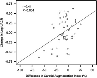 The effects of percutaneous transluminal angioplasty (PTA) on hemodynamic parameters are not established. We tested the hypothesis that PTA would achieve reductions in hemodynamic and target organ damage (TOD) measures in patients with peripheral artery disease (PAD). We enrolled 56 consecutive PAD patients who were scheduled to undergo elective PTA procedures. Brachial blood pressure (BP), central BP, left ventricular mass index (LVMI) and urinary microalbumin excretion ratio (UACR) were assessed at baseline and follow-up. The ankle–brachial index in the diseased leg significantly improved after the PTA (P<0.001). Compared with the pretreatment levels, brachial and central BPs, the carotid augmentation index (AI) and central augmentation pressure (AP) were significantly reduced after the PTA, as were LVMI and UACR. The change in AI in the PTA group was significantly associated with the extent of change in LVMI (P=0.002) and marginally associated with the change in UACR (P=0.07), independently of other covariates. In conclusion, in patients with PAD, significant reductions in carotid AI were observed by PTA treatment; these changes may be attributable to improvements in measures of cardiac and renal target organ damage.