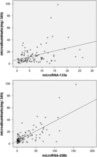 Microalbuminuria is an established early marker of endothelial dysfunction and damage. MicroRNAs (miRNAs) are emerging as essential modulators of cardiovascular physiology and disease. In the present study, we sought an association between the differential expression of related miRNAs in the peripheral blood mononuclear cells of untreated patients with newly diagnosed essential hypertension and the levels of urinary albumin excretion. We assessed the expression of the miRNAs miRNA-1, miRNA-133a, miRNA-26b, miRNA-208b, miRNA-499 and miRNA-21 in consecutive subjects with untreated newly diagnosed essential hypertension (aged 62.5±9.7 years) and with no indications of other organic heart disease. MiRNA expression levels in peripheral blood mononuclear cells were quantified by real-time reverse transcription-polymerase chain reaction. The prevalence of microalbuminuria was 9.8%. miRNA-208b and miRNA-133a were independently correlated with 24-h urinary albumin excretion. More specifically, a strong association was found between the gene expression levels of miRNA-208b in our patients’ peripheral blood cells and urinary albumin (r=0.72, P<0.001). A similar association was found for miRNA-133a (r=0.372, P<0.001). In conclusion, miRNA-208b and miRNA-133a show distinct profiling in peripheral blood cells isolated from untreated patients with recently diagnosed essential hypertension. Their gene expression levels reveal a strong correlation with urinary albumin excretion levels. Our findings provide new perspectives on the development of a new generation of biomarkers for the better monitoring of end-organ damage in hypertension.