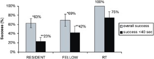 Fifty neonatal intubations were assessed, of which 73% of the attempts were deemed successful. A higher proportion of endotracheal tubes were successfully placed by RTs (100%, P<0.05), compared with both NICU fellows (69%) and pediatric residents (63%). The overall mean time for successful neonatal intubation was 51±28 s, which is greater than twice the time currently recommended by the NRP and American Heart Association guidelines. Attempts by pediatric residents and NICU fellows were longer (P<0.05, analysis of variance) and received lower global assessment scale (P<0.05, analysis of variance) and checklist (P<0.05, analysis of variance) scores, when compared with RTs.