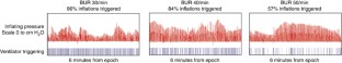 The 26 infants studied were median (inter-quartile range) gestational age 27 (26, 30) weeks, birth weight 0.84 (0.75, 1.14) kg and FiO2 0.24 (0.21, 0.31) and age 6 (4, 19) days. At BURs of 30, 40 and 50, the proportions of inflations, which were triggered, were mean (s.d.) 85% (11), 75% (19) and 61% (25); P<0.01 for all comparisons. Total delivered inflation rates were 56 (8), 58 (9) and 62 (8) min−1, respectively. Cardiorespiratory parameters did not vary between the settings.