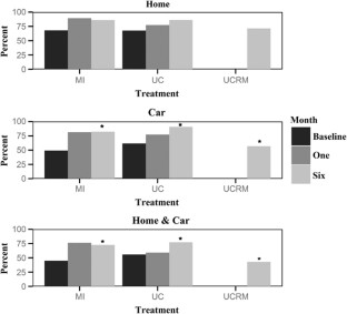 For households that did not have a total smoking ban at baseline, 63.6% of those in the MI group instituted a ban by 1-month post discharge compared with 20% of the UC group, P<0.02. Six months post discharge, fewer smoking bans were noted in the UC-RM group relative to MI and UC, P<0.01.
