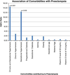 Below the Institute of Medicine threshold of 25(OH)D for pregnant women (25 ng ml−1), obesity (P=0.055) and pregestational diabetes (odds ratio (OR)=2.056) were observed. The study median was 16 ng ml−1 (<25th percentile), at which gestational hypertension (P=0.042), chronic hypertension (OR=4.842) and pregestational diabetes (OR=3.45) became relevant. The risk for preeclampsia increased 12-fold with gestational hypertension (P=0.003) and 14-fold with combined chronic and gestational hypertension (P=0.001).