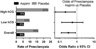 Pre-eclampsia incidence was lower with LDA than with placebo (6% vs 16%, OR 0.32, 95% CI 0.12 to 0.82). An hCG threshold of 29.96 IU ml−1 best predicted pre-eclampsia. In patients with hCG <29.96 IU ml−1, the differences in pre-eclampsia incidence or time of onset were not significant. In patients with hCG >29.96 IU ml−1, LDA was associated with lower pre-eclampsia incidence than placebo (6% vs 23%, OR 0.21, 95% CI 0.06 to 0.79) and delayed onset.