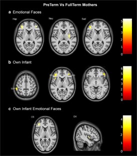While viewing own infant’s face preterm mothers showed increased activation in emotional processing area (i.e., inferior frontal gyrus) and social cognition (i.e., supramarginal gyrus) and affiliative behavior (i.e., insula).