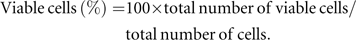 HK-2 cells were inoculated in 24-well culture plates with DMEM medium containing 30 mmol/l glucose and NCTD (0, 0.5, 2.5, 5, 10, 20, and 40 mg/l), using three wells for each concentration of NCTD and then with 10% FBS for another 24 h. At the end of the time period, cells were washed twice with PBS and trypsinized with 0.05% trypsin with 0.02% EDTA. Cell suspensions were centrifuged, and the supernatant was discarded. Single-cell suspension was prepared and then diluted to 1 × 106 cells/ml by mixing with 0.4% Trypan blue. The mixture was incubated for 3 min at room temperature and observed in a blood counting chamber. The unstained (viable) and stained (nonviable) cells were counted separately in five random visual fields. The percentages of viable cells were calculated as follows: