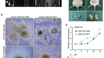 All animals for in vivo experimentations were housed under pathogen-free conditions in accordance with the institutional guidelines of the regional Ethical Committee for animal experiments (CEEA Pays de la Loire n°06) and under the supervision of authorized investigators. For subcutaneous transplantation, 6-week-old female Balb/cRj-nude mice (Charles River, Wilmington, MA, USA) were anesthetized by inhalation of an isoflurane-air mixture (2%, 0.2 l/min) and injected with Buprecare (20 μg/kg, Animalcare, York, UK). A slight incision was made into the skin along the right flank of the mouse, to where a 2 × 2 × 2-mm3 fragment of a thawed biopsy was transplanted, and the subcutaneous wounds were then sutured. Animals were followed for more than 4 months and tumor volume was quantified by measuring two perpendicular diameters with a caliper and calculated with the formula (l2 × L)/2, where l is the smallest and L the largest diameter. When tumors reached 1000 mm3, mice were killed and tumor fragments were collected.