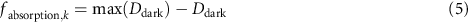 The absorption function, fabsorption, for kth tissue component is obtained by first calculating the Euclidean distance transform32 (Ddark) of all points in red-blue color space from the point with highest absorption (ie, darkest) on the kth tissue-component ridge (Rk), defined as the point on the ridge closest to black (r=0, b=0). To scale the distance with level of absorption of dye, the absorption function (Supplementary Figure S3b(ii)), is expressed by
