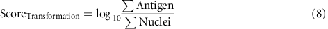 A TMA of ovarian cancer tissue stained using an antibody for LINE-1 ORF1p31 was used to evaluate the utility of NLTD as an immunohistochemistry scoring aide. Each image in the TMA was separated into two images using the NLTD method, a nuclei- and an antigen-rich image (Supplementary Figure S5). Preprocessing steps were performed to only analyze nuclei-rich regions where antigen staining was present, and avoid background areas where no staining should occur. Briefly, the nuclei-rich image was segmented using Otsu’s thresholding technique.35 Small objects were removed from the image, followed by morphological opening and closing operations and another removal of small objects. After preprocessing, a transformation score was derived based on the ratio of antigen intensity to nuclei intensity (Equation (8)). Importantly, only antigen and nuclei intensity in the areas from the segmented, preprocessed image were counted.