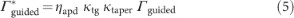 We use two different metrics to characterize our observed system efficiency. The first, relating the number of guided photons to the total possible number of photons emitted with a unity quantum efficiency, is given by: