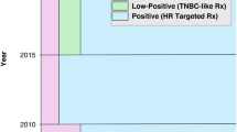 The tumor ER, PR, and HER2 status was available from pathology reports. Immunohistochemistry for ER and PR was performed using the 6F11 and 1A6 antibodies, respectively, and iVIEW detection on the BenchMark XT (Ventana, Tucson, AZ, USA) at the time of initial diagnosis. At our institution, ER and PR are scored using a semi-quantitative H-score like method which details the percentage of cells showing none, weak, moderate or strong staining.10, 11 The score is given as the sum of the percent staining multiplied by an ordinal value corresponding to the intensity level (0=none, 1=weak, 2=moderate and 3=strong). With four intensity levels, the resulting score ranges from 0 (no staining in the tumor) to 300 (diffuse strong staining of the tumor). An immunohistochemical score >10 was considered a positive result for ER and PR. HER-2/neu protein was analyzed and scored using CB11 antibody and basic DAB detection on BenchMark XT (Ventana, Tucson, AZ, USA). HER-2/neu slides were reviewed and scored as follows: 0 as no membranous reactivity or reactivity in <10% of the tumor cells; 1+ as faint/barely perceptible membranous reactivity in >10% of the tumor cells; 2+ as weak to moderate complete membranous staining in >10% of the tumor cells; and 3+ as strong membranous staining in >30% of the tumor cells. HER-2/neu was considered as negative for immunohistochemical scores 0 and 1. HER-2/neu was considered as positive with either 3+ immunoreactivity or unequivocal amplification by fluorescence in situ hybridization (PathVysion Vysis dual color FISH by Vysis, Downers Grove, IL, USA) in 2+ cases. Cases with ‘equivocal results’ by fluorescence in situ hybridization were considered as negative for HER2 in this study.