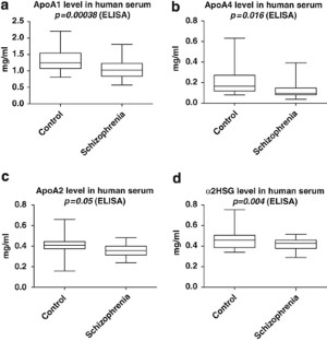 Huang JT, Wang L, Prabakaran S, Wengenroth M, Lockstone HE, Koethe D et al. Independent protein-profiling studies show a decrease in apolipoprotein A1 levels in schizophrenia CSF, brain and peripheral tissues. Mol Psychiatry 2008; 13: 1118–1128.
