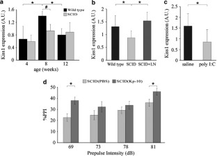 Neuropsychological syndromes including schizophrenia often do not manifest until late adolescence or early adulthood. Studies attributing a role in brain maintenance to the immune system led us to propose that malfunction of immune-dependent regulation of brain functions at adolescence underlies the late onset of such diseases/syndromes. One such function is sensorimotor gating, the ability to segregate a continuous stream of sensory and cognitive information, and to selectively allocate attention to a significant event by silencing the background (measured by prepulse inhibition; PPI). This activity is impaired in schizophrenia, as well as in several other neuropsychological diseases. Using a model of prenatal immune activation (maternal polyriboinosinic–polyribocytidylic acid (poly I:C) injection), often used as a model for schizophrenia, and in which abnormal PPI has a delayed appearance, we demonstrated a form of immune deficit in the adult offspring. Similar abnormal PPI with a delayed appearance was found in congenitally immune-deficient mice (severe combined immune deficient, SCID), and could be reversed by immune reconstitution. This functional deficit correlated with impairment of both hippocampal neurogenesis and expression of the gene encoding kisspeptin (Kiss1) that manifested at adulthood. Moreover, exogenous administration of a kisspeptin-derived peptide partially reversed the gating deficits in the SCID mice. Our results suggest that a form of congenital immune deficiency may be a key factor that determines manifestation of developmental neuropsychological disorders with onset only at early adulthood.