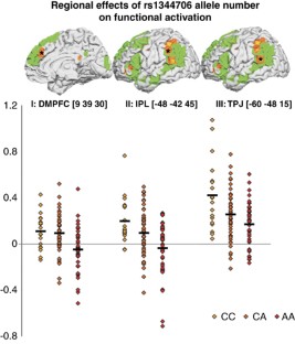 Schizophrenia is associated with marked deficits in theory of mind (ToM), a higher-order form of social cognition representing the thoughts, emotions and intentions of others. Altered brain activation in the medial prefrontal cortex and temporo-parietal cortex during ToM tasks has been found in patients with schizophrenia, but the relevance of these neuroimaging findings for the heritable risk for schizophrenia is unclear. We tested the hypothesis that activation of the ToM network is altered in healthy risk allele carriers of the single-nucleotide polymorphism rs1344706 in the gene ZNF804A, a recently discovered risk variant for psychosis with genome-wide support. In all, 109 healthy volunteers of both sexes in Hardy–Weinberg equilibrium for rs1344706 were investigated with functional magnetic resonance imaging during a ToM task. As hypothesised, risk carriers exhibited a significant (P<0.05 false discovery rate, corrected for multiple comparisons) risk allele dose effect on neural activity in the medial prefrontal cortex and left temporo-parietal cortex. Moreover, the same effect was found in the left inferior parietal cortex and left inferior frontal cortex, which are part of the human analogue of the mirror neuron system. In addition, in an exploratory analysis (P<0.001 uncorrected), we found evidence for aberrant functional connectivity between the frontal and temporo-parietal regions in risk allele carriers. To conclude, we show that a dysfunction of the ToM network is associated with a genome-wide supported genetic risk variant for schizophrenia and has promise as an intermediate phenotype that can be mined for the development of biological interventions targeted to social dysfunction in psychiatry.
