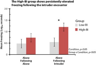 Children with an anxious temperament are prone to heightened shyness and behavioral inhibition (BI). When chronic and extreme, this anxious, inhibited phenotype is an important early-life risk factor for the development of anxiety disorders, depression and co-morbid substance abuse. Individuals with extreme anxious temperament often show persistent distress in the absence of immediate threat and this contextually inappropriate anxiety predicts future symptom development. Despite its clear clinical relevance, the neural circuitry governing the maladaptive persistence of anxiety remains unclear. Here, we used a well-established nonhuman primate model of childhood temperament and high-resolution 18fluorodeoxyglucose positron emission tomography (FDG-PET) imaging to understand the neural systems governing persistent anxiety and to clarify their relevance to early-life phenotypic risk. We focused on BI, a core component of anxious temperament, because it affords the moment-by-moment temporal resolution needed to assess contextually appropriate and inappropriate anxiety. From a pool of 109 peri-adolescent rhesus monkeys, we formed groups characterized by high or low levels of BI, as indexed by freezing in response to an unfamiliar human intruder’s profile. The high-BI group showed consistently elevated signs of anxiety and wariness across >2 years of assessments. At the time of brain imaging, 1.5 years after initial phenotyping, the high-BI group showed persistently elevated freezing during a 30-min ‘recovery’ period following an encounter with the intruder—more than an order of magnitude greater than the low-BI group—and this was associated with increased metabolism in the bed nucleus of the stria terminalis, a key component of the central extended amygdala. These observations provide a neurobiological framework for understanding the early phenotypic risk to develop anxiety-related psychopathology, for accelerating the development of improved interventions, and for understanding the origins of childhood temperament.