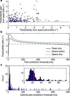Neurons can produce action potentials with high temporal precision1. A fundamental issue is whether, and how, this capability is used in information processing. According to the ‘cell assembly’ hypothesis, transient synchrony of anatomically distributed groups of neurons underlies processing of both external sensory input and internal cognitive mechanisms2,3,4. Accordingly, neuron populations should be arranged into groups whose synchrony exceeds that predicted by common modulation by sensory input. Here we find that the spike times of hippocampal pyramidal cells can be predicted more accurately by using the spike times of simultaneously recorded neurons in addition to the animals location in space. This improvement remained when the spatial prediction was refined with a spatially dependent theta phase modulation5,6,7,8. The time window in which spike times are best predicted from simultaneous peer activity is 10–30 ms, suggesting that cell assemblies are synchronized at this timescale. Because this temporal window matches the membrane time constant of pyramidal neurons9, the period of the hippocampal gamma oscillation10 and the time window for synaptic plasticity11, we propose that cooperative activity at this timescale is optimal for information transmission and storage in cortical circuits.