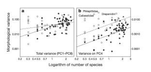 Morphological diversity tends to increase within evolving lineages over time1,2, but the relative roles of gradual evolutionary change (anagenesis)3 and abrupt shifts associated with speciation events (cladogenesis, or ‘punctuated equilibrium’)4 have not been resolved for most groups of organisms5. However, these two modes of evolution can be distinguished by the fact that morphological variance increases in proportion to time under anagenesis6, and in proportion to the logarithm of the number of species under cladogenesis7. Although species and time are themselves correlated, multiple regression analysis provides a statistical framework for partitioning their relative contributions. In this study, I use multiple regressions to evaluate the effects of time and species number on morphological diversity within clades of passerine birds. The results show clearly that number of species exerts a strong influence on morphological variance independent of time, but that time has no unique effect. Thus, morphological evolution in birds seems to be associated with cladogenesis. How lineage splitting promotes morphological diversification poses an important challenge to ecologists and evolutionary biologists.