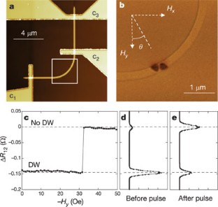 Klaui, M. et al. Controlled and reproducible domain wall displacement by current pulses injected into ferromagnetic ring structures. Phys. Rev. Lett. 94, 106601 (2005)