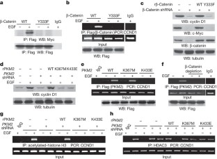The embryonic pyruvate kinase M2 (PKM2) isoform is highly expressed in human cancer. In contrast to the established role of PKM2 in aerobic glycolysis or the Warburg effect1,2,3, its non-metabolic functions remain elusive. Here we demonstrate, in human cancer cells, that epidermal growth factor receptor (EGFR) activation induces translocation of PKM2, but not PKM1, into the nucleus, where K433 of PKM2 binds to c-Src-phosphorylated Y333 of β-catenin. This interaction is required for both proteins to be recruited to the CCND1 promoter, leading to HDAC3 removal from the promoter, histone H3 acetylation and cyclin D1 expression. PKM2-dependent β-catenin transactivation is instrumental in EGFR-promoted tumour cell proliferation and brain tumour development. In addition, positive correlations have been identified between c-Src activity, β-catenin Y333 phosphorylation and PKM2 nuclear accumulation in human glioblastoma specimens. Furthermore, levels of β-catenin phosphorylation and nuclear PKM2 have been correlated with grades of glioma malignancy and prognosis. These findings reveal that EGF induces β-catenin transactivation via a mechanism distinct from that induced by Wnt/Wingless4 and highlight the essential non-metabolic functions of PKM2 in EGFR-promoted β-catenin transactivation, cell proliferation and tumorigenesis.