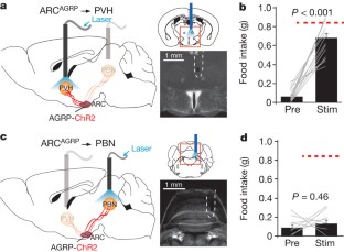 Aponte, Y., Atasoy, D. & Sternson, S. M. AGRP neurons are sufficient to orchestrate feeding behavior rapidly and without training. Nature Neurosci. 14, 351–355 (2011)