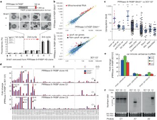a, Schematic representation of the PfRNase II–HA fusion protein. b, Examination of the integration event of PfRNase II–HA transfectants by PCR with genomic DNA. c, Western blot of PfRNase II–HA line with anti-HA and anti-aldolase antibodies. d, qPCR analysis of individual var genes in two independent PfRNase II–HA clones. Samples were harvested at the ring stage. The data are shown as relative copy numbers related to the seryl-tRNA synthetase gene. e, ChIP–qPCR of PfRNase II–HA transfectant. The enrichment of distinct var-subtype var genes with anti-HA antibody is shown. Error bars represent s.e.m. for three independent experiments. f, The plasmodial exosome is expected to exert its functions as described in other eukaryotic organisms (i), whereas the additional non-exosome exoribonuclease PfRNase II has evolved as a regulator of expression of upsA-type var genes in P. falciparum (ii). The 3′–5′ exoribonuclease activity may need other helper molecules to access the 3′ end of nascent RNA. Alternatively, a potential N-terminal PIN-like domain of PfRNase II may help to degrade the nascent RNA by its endonuclease activity as described in yeast42. For b and c, data are representative of three independent experiments.