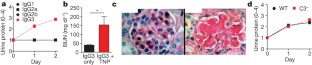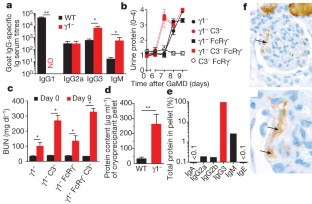 a–d, BALB/c wild-type (WT) and γ1− mice (5 per group) were immunized with GaMD on day 0 and injected with 1 mg of either anti-IFN-γ or control monoclonal antibody (mAb) on days 0 and 5. a, Total levels of all Ig isotypes were determined in 24 h culture supernatants of spleen cells harvested on the days shown. b, GaMD-immunized γ1−, γ1−/FcRγ−, γ1−/C3−, C3−/FcRγ− and γ1−/C3−/FcγR− mice (5 per group) had their urine tested for leukocyte esterase and blood on the days shown. c, d, BALB/c wild-type and γ1− mice (5 per group) were immunized with GaMD on day 0 and injected with 1 mg of either anti-IFN-γ or control monoclonal antibody on days 0 and 5. c, Urine obtained on days indicated was assayed for protein, leukocyte esterase and blood. d, BUN levels were determined before and 10 days after GaMD immunization. *P < 0.05.