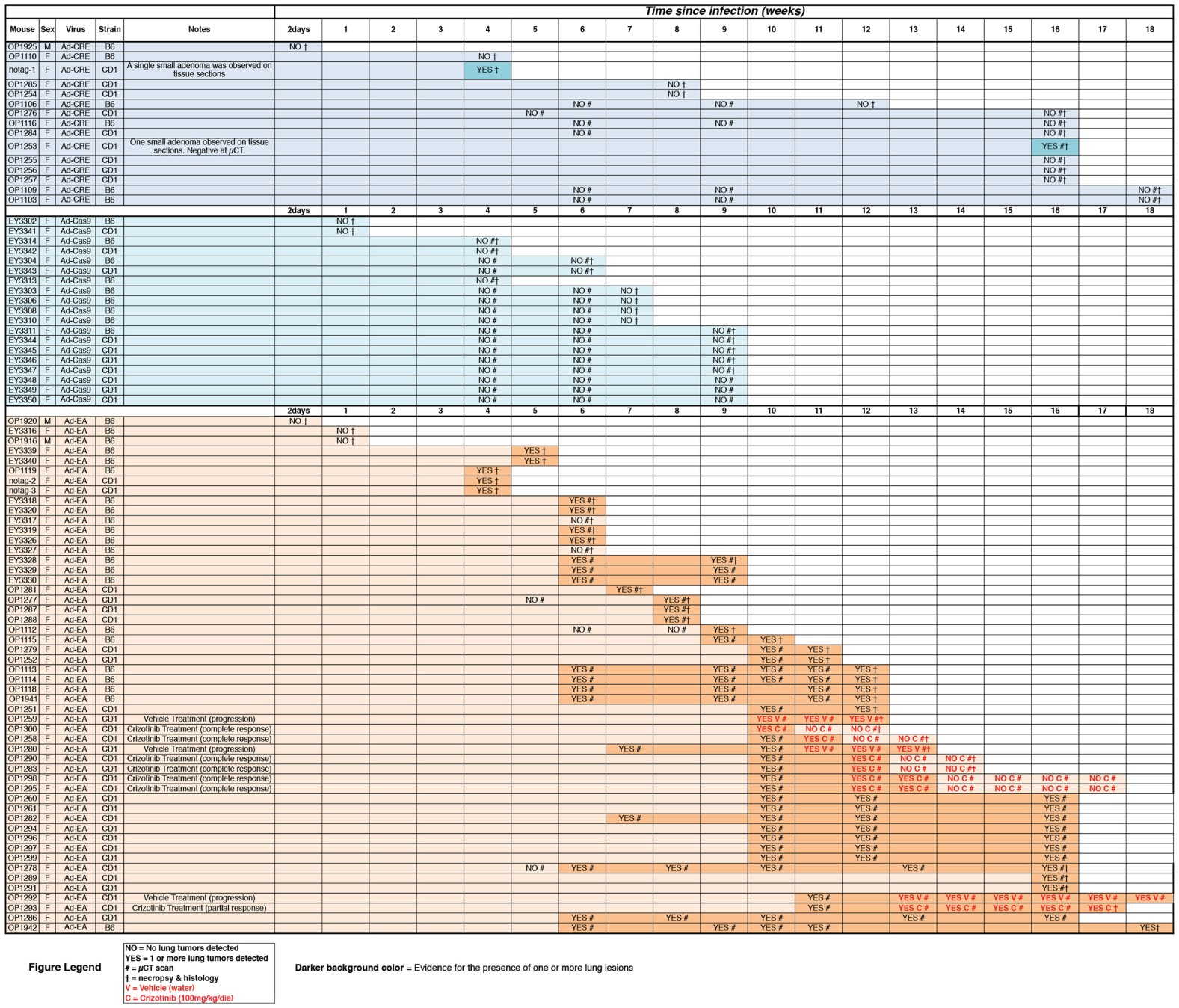 1. This spreadsheet contains an annotated list of every mouse used in this study and the virus used for the intratracheal infection. The interval (in weeks) since infection is shown as a coloured horizontal bar. The time, outcome, and method of tumour detection are also reported. Symbols used are: YES = one or more tumour detected; NO = no tumours detected. # = evaluation by µCT; † = evaluation by necropsy and histopathology; V = mouse treated with vehicle (water); C = mouse treated with crizotinib (100 mg per kg per day).