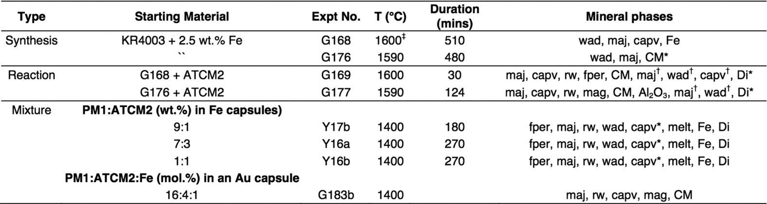 1. capv, calcium perovskite; CM, carbonatite melt; Di, diamond; Fe, Fe metal; fper, ferropericlase; mag, magnesite; maj, majorite garnet; rw, ringwoodite; wad, wadsleyite.