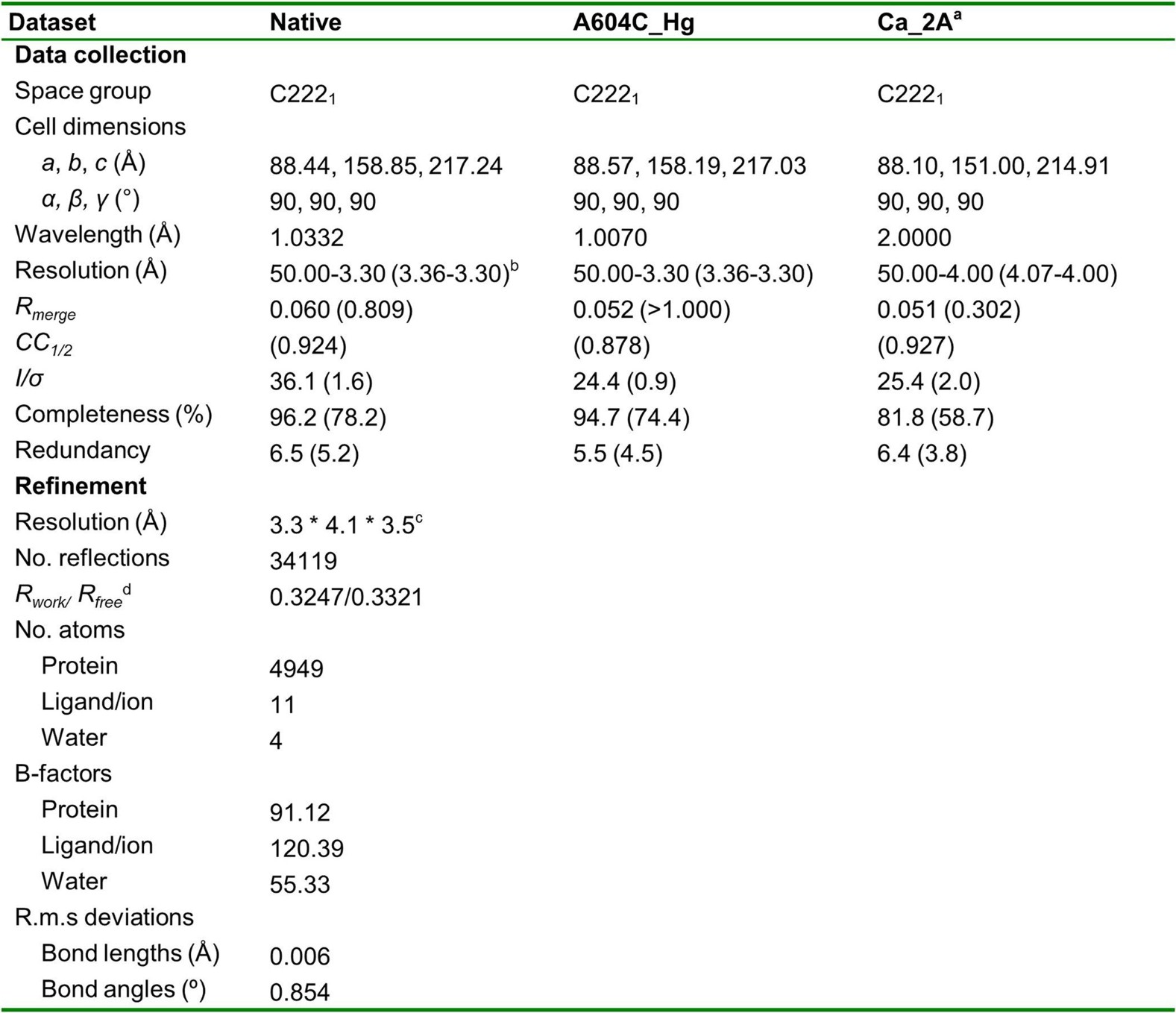 1. aThe crystal was grown in 1 mM CaCl2 and no barium; the data was collected at 2 Å wavelength to maximize the calcium anomalous signal.