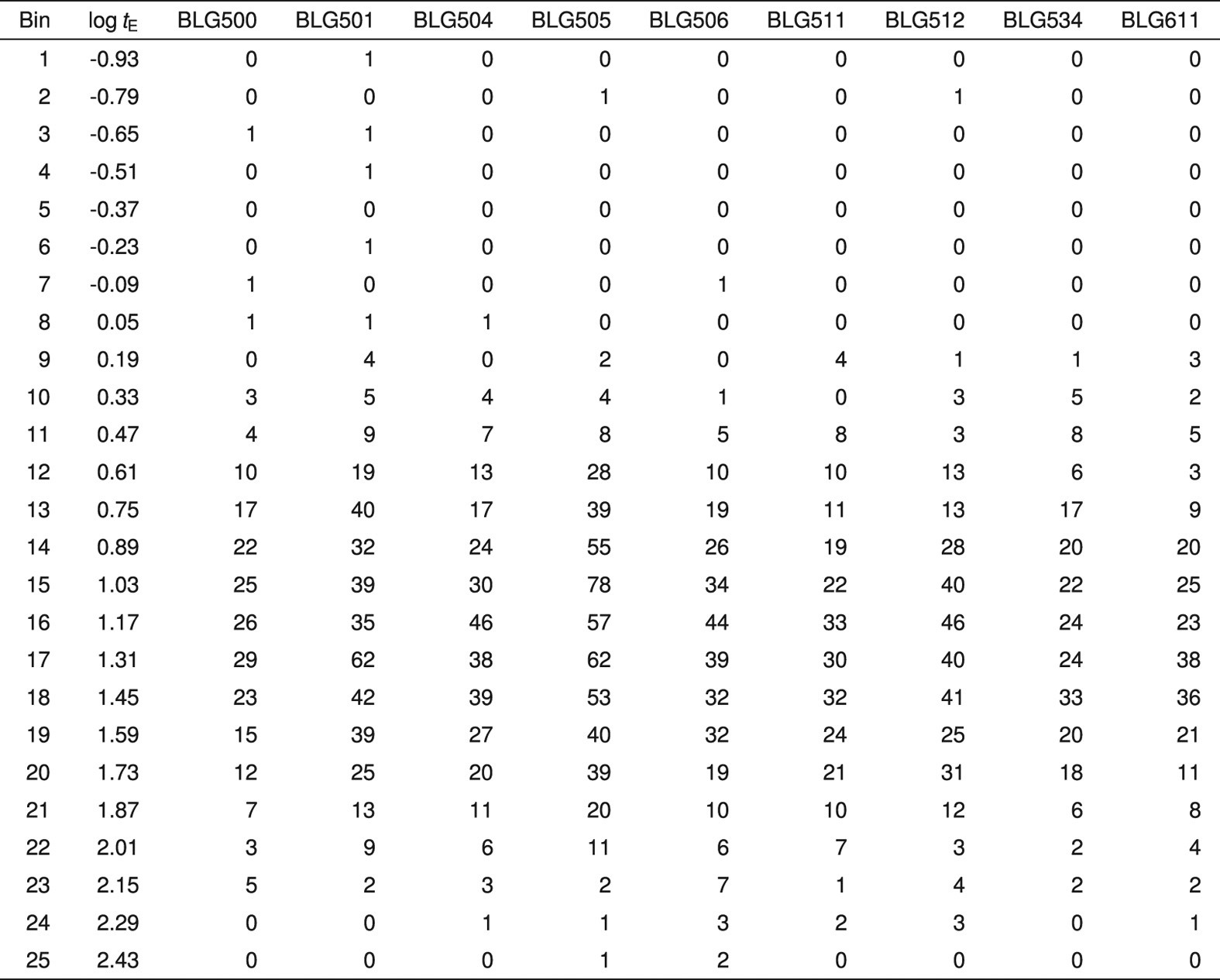 Extended Data Table 4 Number of events detected in individual timescale bins