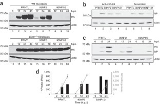 This material is based upon work supported in part by the US Army Research Laboratory and the US Army Research Office under grant number 54677-LS-YIP. J.T.P. is supported by the NYU-MSSM Mechanisms of Virus-Host Interactions National Institutes of Health T32 training grant (no. AI007647-09). B.R.t. is supported in part by the Pew Charitable Funds. We thank A. Garcia-Sastre for giving us polyclonal A/PR/8/34 (MSSM, NY); G. Sen for ISG54 (Cleveland Clinic, OH, USA); A. Fernandez-Sesma (MSSM, NY) for primary human dendritic cell RNA; A. Tarakhovsky (Rockefeller University, NY) and D. O'Carroll (EMBL, Monterotondo, Italy) for Dicer−/− murine fibroblasts; E. Makeyev (Nanyang Technological University, Singapore) for firefly luciferase constructs containing miR-124 MREs and control SV40 3′ UTRs; and P. Palese (MSSM, NY) for pPol-I driven nucleoprotein vector, monoclonal nucleoprotein and A/PR/8/34 NS1. We thank members of the Palese and Garcia-Sastre labs for advice, reagents and comments during the course of this work.