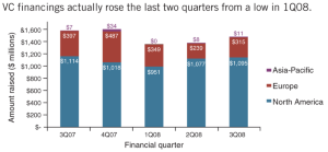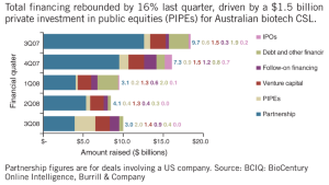 Despite the dismal economic climate, biotech stocks, financing, acquisitions and partnerships remained relatively solid. Although biotech indices have climbed only slightly since the beginning of 3Q07, they have performed much better than the broader indices, which plunged. Large bids to acquire Genentech (S. San Francisco, CA, USA) and ImClone (New York) also generated interest in the sector. Financing is unlikely to outstrip the $53 billion high in 2007, but last quarter actually managed to improve over a recent low in 2Q08.