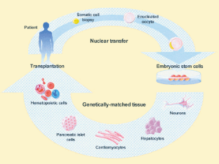 The successful application of nuclear transfer techniques to a range of mammalian species has brought the possibility of human therapeutic cloning significantly closer. The objective of therapeutic cloning is to produce pluripotent stem cells that carry the nuclear genome of the patient and then induce them to differentiate into replacement cells, such as cardiomyocytes to replace damaged heart tissue or insulin-producing β cells for patients with diabetes. Although cloning would eliminate the critical problem of immune incompatibility, there is also the task of reconstituting the cells into more complex tissues and organs in vitro. In the review, we discuss recent progress that has been made in this field as well as the inherent dangers and scientific challenges that remain before these techniques can be used to harness genetically matched cells and tissues for human transplantation.