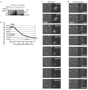 J.N. performed the biochemical experiments; M.Y. performed the imaging experiments; J.M. constructed the Lys-less Cdc20 and control Cdc20 constructs; J.N., M.Y. and J.P. designed the experiments; J.P. wrote the paper with help from J.N. and M.Y.