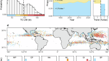 The LMI here is defined using maximum wind speed. Maximum wind speed itself is not an observed quantity, but rather estimated from in situ observations, remotely sensed estimates of winds or via satellite-based techniques29. The distribution of LMI is calculated globally, as well as for individual basins, following the definitions of the NHC and JTWC, that is, North Atlantic and eastern North Pacific (from NHC), and western North Pacific, North Indian Ocean and southern Hemisphere basins (from JTWC). Correlations between global LMI and storm lifetime are calculated using Spearman’s rank correlation coefficient.
