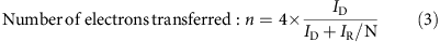 The ORR was measured using RRDE-3A (ALS Co) as a rotator and a ring disk electrode (A-011162, ALS Co) as a working electrode. The catalyst ink was prepared by dispersing 5 mg catalysts in Nafion solution (6.5 ml, Nafion/catalyst=10%). The working electrode was prepared by dropping the catalyst ink (8.2 μl) onto the glassy carbon (4-mm diameter) of the ring disk electrode and then drying at room temperature. Loading amount of the catalysts was 50 μg cm−2 (2.5 μgPt cm−2). The ORR responses were recorded with a 10 mV s−1 scan rate in an O2-saturated electrolyte (rotating speed: 900 r.p.m., scan range: 0–1.1 VRHE). ORR results were presented after subtraction of the currents measured in an N2-saturated 0.1 M HClO4 electrolyte to remove capacitances. H2O2 selectivity and number of electrons transferred (n) were calculated from RRDE tests (equations 2 and 3), which were carried out by applying 1.2 VRHE on the ring disk of the working electrode at a 900 r.p.m. speed.