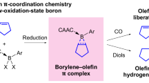 As classical trivalent boranes inherently possess an unoccupied p-orbital on the boron centre, they have been widely utilized as electron-pair acceptors or Lewis acids in synthetic chemistry1. Apart from this line of research, isolable nucleophilic and low-valent boron species have also attracted great attention in recent years since the seminal work by Nozaki, Yamashita and co-workers2,3,4,5,6,7,8,9,10,11. Among them, by installing two carbene ligands, the Bertrand group and our group developed neutral tricoordinate organoboron species isoelectronic with amines12,13,14,15. Braunschweig and co-workers reported relevant species, including the first complex featuring two carbon monoxide ligands coordinating to a boron centre16,17. In these twofold base adducts of monovalent boron, electrons in the filled p-orbital of the boron centre are delocalized into the formally empty p-orbitals or the π*-orbitals of the ligands. Thus, the bonding situation therein is reminiscent of the σ donation and π back donation between a metal and a ligand in conventional transition metal complexes18,19, and there seems to exist similarity between this type of boron and transition metals, although there is controversy regarding how to interpret such bonding in main group compounds20,21,22.