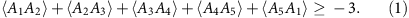 This inequality can be violated in quantum mechanics. Here we consider a qutrit system, with five dichotomic observables Ai=2|li〉〈li|−1 corresponding to states represented by vertices of the pentagram shown in Fig. 1. Each observable can be described by a pair of projectors {|li〉〈li|, I−|li〉〈li|} associated with outcomes {+1, −1}. The states connected by edges of the pentagram are orthogonal, ensuring that the corresponding observables, Ai and Ai+1, (and their measurement operators) commute, making them compatible observables. Quantum mechanics predicts that the left side of (1) evaluates to 5−4